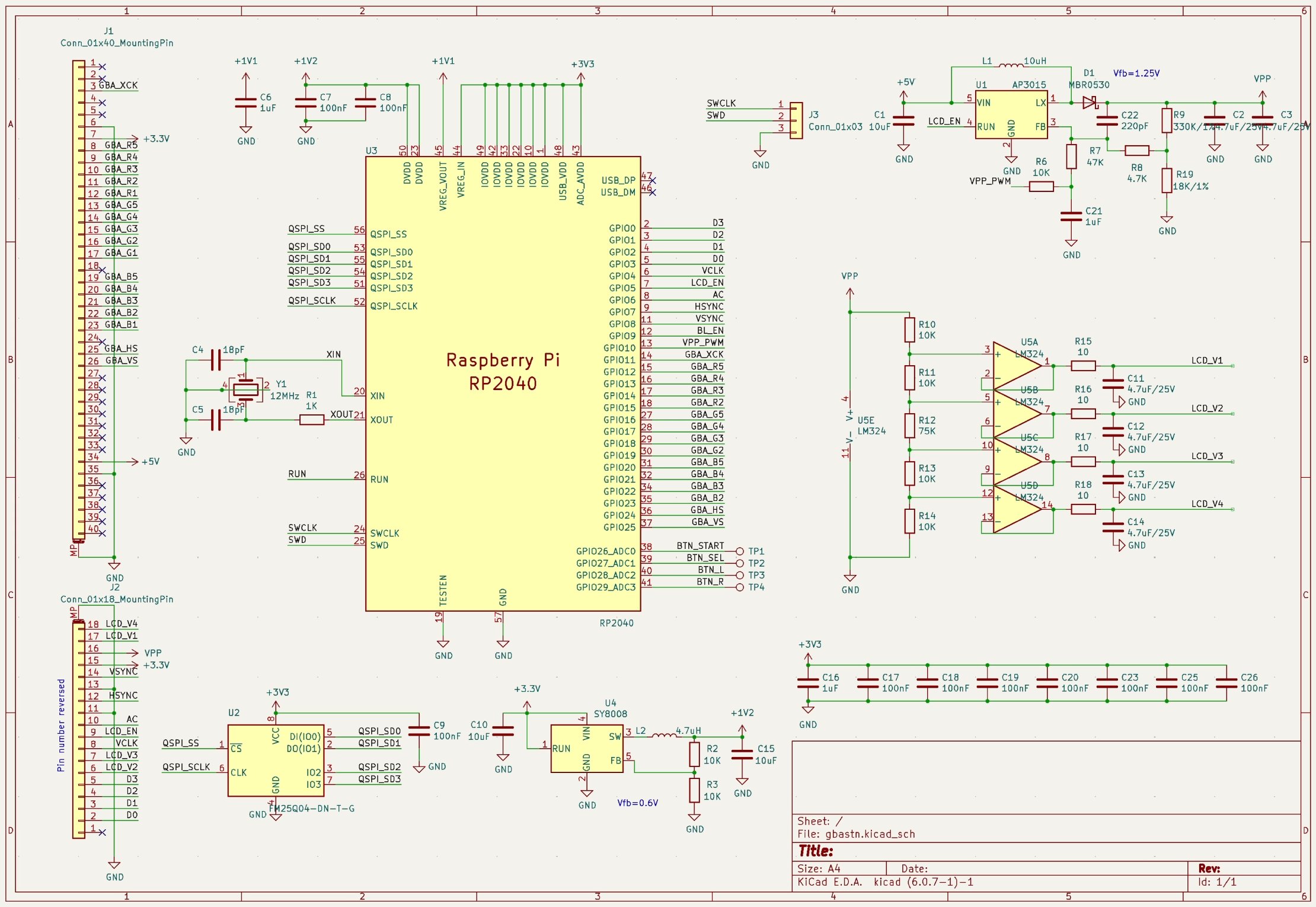Apparently, these screens use different protocols. So directly hooking up the signal won’t work. I will need some chips to convert between them. Normally, a low-power FPGA would be the best choice here. However, when I was building this project earlier this year, all variants of ICE40, MAX10, or SPARTAN 6 7 FPGAs are out of stock. As a result, I decided to give RP2040 another go. With that being said, the plan is to use PIO to capture the LCD output of GBA, then combine with what I had previously, a software sigma-delta modulation grayscale scheme, to convert the color display output from GBA to a grayscale LCD input. Let’s look at the schematics.